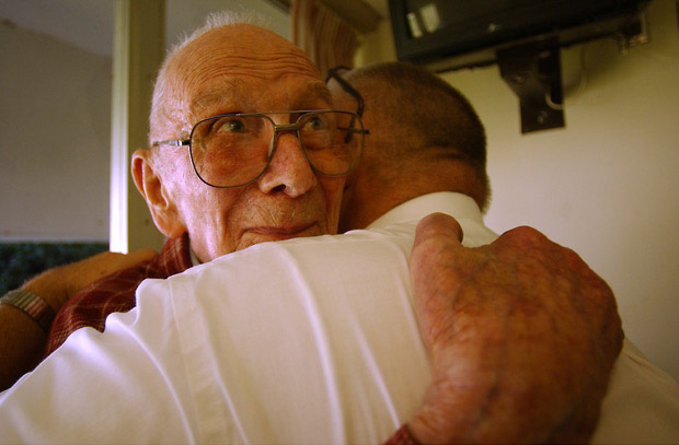 Pastor Elliot embraces Harvey Koch, 92, during one of his regular visits to Hermann Area District Hospital.