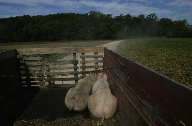 Two hogs huddle in the back of the truck as Terry journeys 12 miles through the hill farms and gravel paths to deliver them to the market in New Haven.