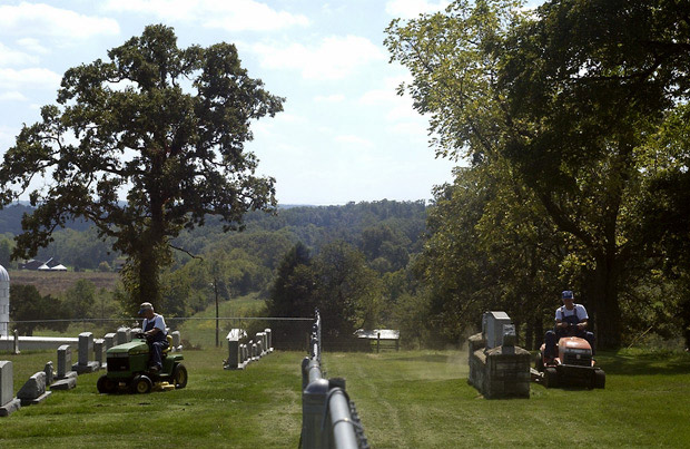 Marvin & Martin The Rohlfing twins occassionally take a break from their farms around Hermann, Missouri to mow the lawn of Bethany United Church of Christ. Martin serves as a member of the cemetery board, while Marvin refers to himself as "just a helper." [9 of 12]