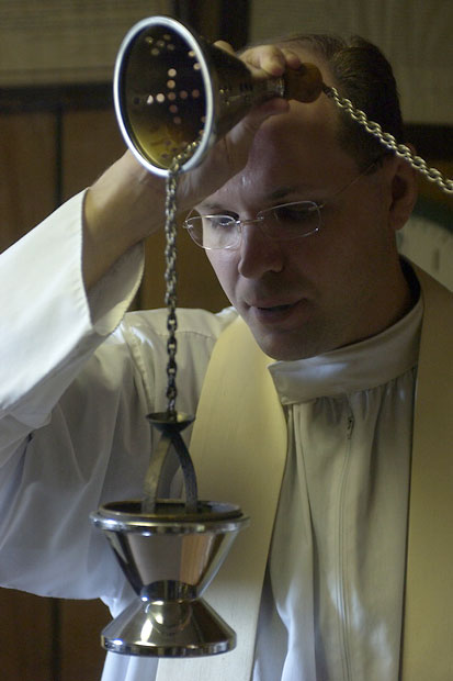 Father Bill lights charcoal to heat incense before the funeral of Leslie Franklin, 83.