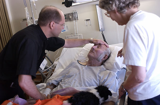 Father Bill Father Bill administers the Last Rites to parishioner Julius Klott as Klott's wife, Rose, joins in prayer at the Hermann Area Hospital. Julius died a week later. "There are some things worse than death," the priest says. "Dying people need to die." [5 of 13]