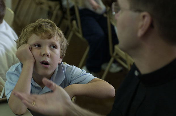 Kindergartner Austin Gerlemann listens to Father Bill as he talks about why we pray before a meal.