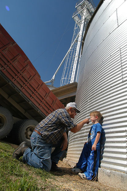 Dollars and Sense As hundreds of bushels of grain are loaded into storage, Melvin Jacob takes a few minutes for one of his twin grandsons Emmett Scheible at the family farm in Hermann Missouri. Emmett and his twin brother could potentially be the 6th generation to work the land. [5 of 9]